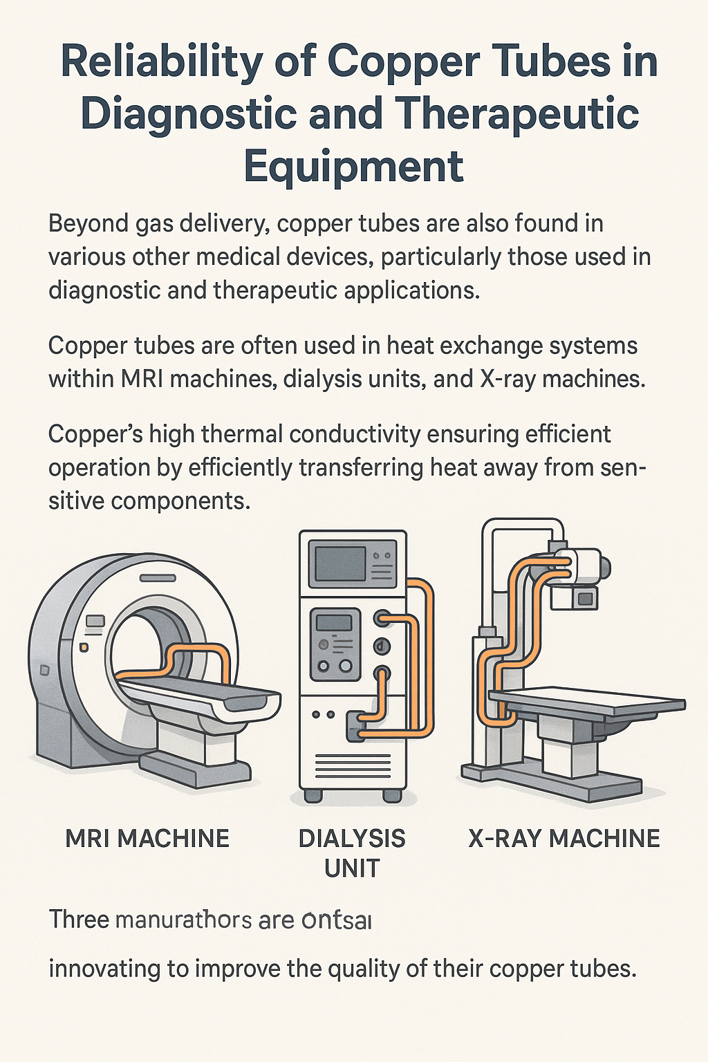 Kromě dodávky plynu se měděné trubky nacházejí také v různých jiných lékařských zařízeních, zejména v těch, které se používají v diagnostické a terapeutické aplikace . Často se například používají měděné trubky systémy výměny tepla v lékařském vybavení, jako jsou přístroje MRI, dialyzační jednotky a rentgenové přístroje. Vysoká tepelná vodivost mědi zajišťuje, že tyto stroje fungují efektivně a bezpečně tím, že účinně odvádí teplo od citlivých součástí.