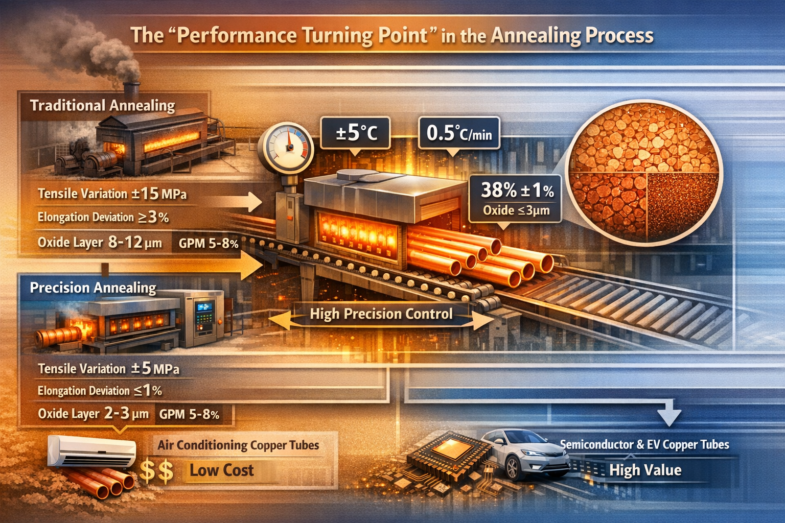 Ačkoli oba procesy zahrnují žíhání, jejich výsledkem jsou značně odlišné úrovně konkurenceschopnosti produktu. Tento zdánlivě nepatrný detail odráží základní logiku transformace čínského průmyslu měděných trubek z „rozšíření měřítka“ na „zlepšení kvality“ – konkurence ve špičkové výrobě často spočívá ve zdánlivě nevýznamných detailech procesu. Procesy, jako je žíhání, moření a leštění, které se zdají být základní, jsou přesně klíčovými faktory omezujícími stabilitu výkonu produktu a skrytými pákami pro společnosti k prolomení bariér nejvyšší třídy.