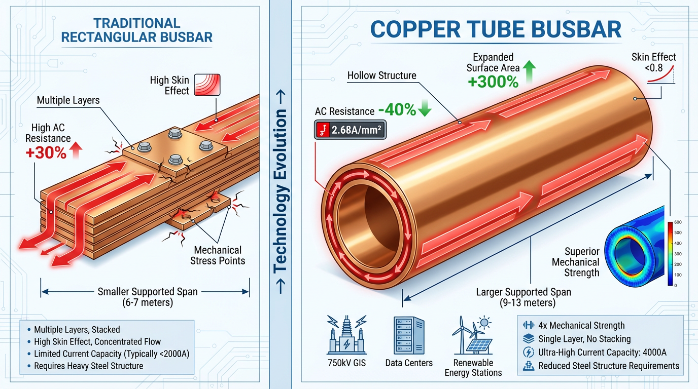 Tato strukturální revoluce přímo řeší bolestivá místa přenosu ultravysokého proudu. V plynem izolovaném rozvaděči 750 kV (GIS) může přípojnice z měděných trubek Φ100 × 5 mm přenášet proud 4000 A s proudovou hustotou pouze 2,68 A/mm². Naproti tomu ekvivalentní pravoúhlé přípojnice vyžadují více naskládaných vrstev , což vede ke zvýšení ztráty o více než 30 %. Ještě důležitější je, že mechanická pevnost přípojnic z měděných trubek je čtyřikrát větší než u pravoúhlých přípojnic. Při působení zkratového proudu 50 kA dosahuje závěsné rozpětí 9 metrů a podepřené rozpětí se rozprostírá na 13 metrů, což výrazně snižuje potřebu ocelových konstrukcí rozvodny.