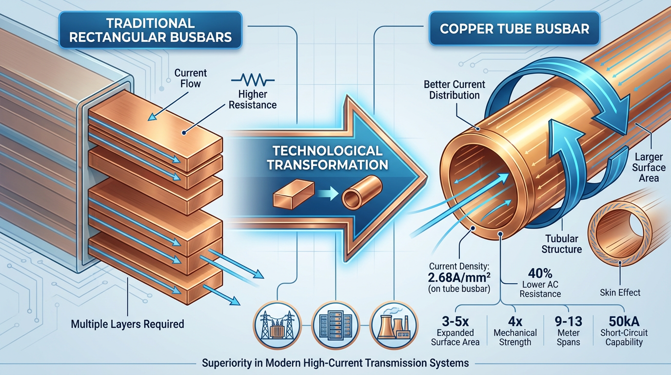 Globální modernizace energetické infrastruktury vyvolává bezprecedentní poptávku měděná trubka přípojnice. I když představují pouze 2 %–3 % celkové poptávky po měděných trubkách, zaznamenávají tyto produkty roční růst přesahující 200 % v aplikacích, jako jsou rozvodny ultravysokého napětí, datová centra a nové energetické elektrárny. Hlavní výhoda spočívá v jejich dutá trubková konstrukce , který rozšiřuje povrch vodiče 3-5krát, zajišťuje rovnoměrné rozložení proudu podél stěny trubky, snižuje koeficient kožního efektu pod 0,8 a snižuje střídavý odpor o 40 % ve srovnání s pravoúhlými přípojnicemi o ekvivalentní ploše průřezu.