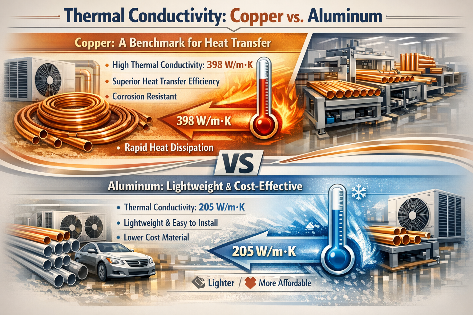 Tato tabulka ukazuje zřetelné rozdíly mezi nimi měď a hliníku trubky, s měď nabízí nadřazené přenos tepla ale za vyšší cenu hliníku je lehčí a nákladově efektivní ale přichází s kompromisy ve výkonu a odolnosti.