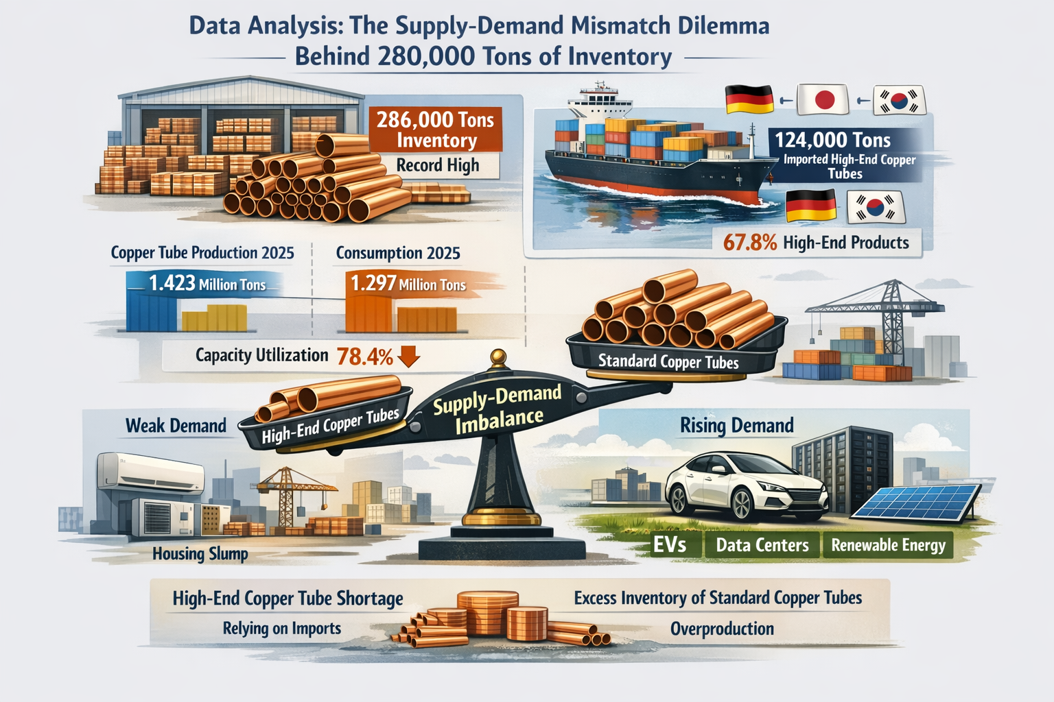 Nejnovější údaje Národního statistického úřadu a Čínské asociace průmyslu neželezných kovů vykreslují obrázek nerovnováhy v čínském průmyslu měděných trubek. V roce 2025 dosáhla národní produkce měděných trubek 1,423 milionu tun, což je meziroční nárůst o 6,8 %, ale zjevná spotřeba ve stejném období byla pouze 1,297 milionu tun a míra využití kapacity klesla na 78,4 %, což je pokles o 4,2 procentního bodu ve srovnání s rokem 2024, což je březen hlavních zásob měděných trubek 205 měděných trubek. v Číně dosáhly 286 000 tun, což je nové maximum za téměř pět let, přičemž zásoby ve východní Číně představují až 52,3 %, což zdůrazňuje zvláště významné regionální nesoulad nabídky a poptávky .