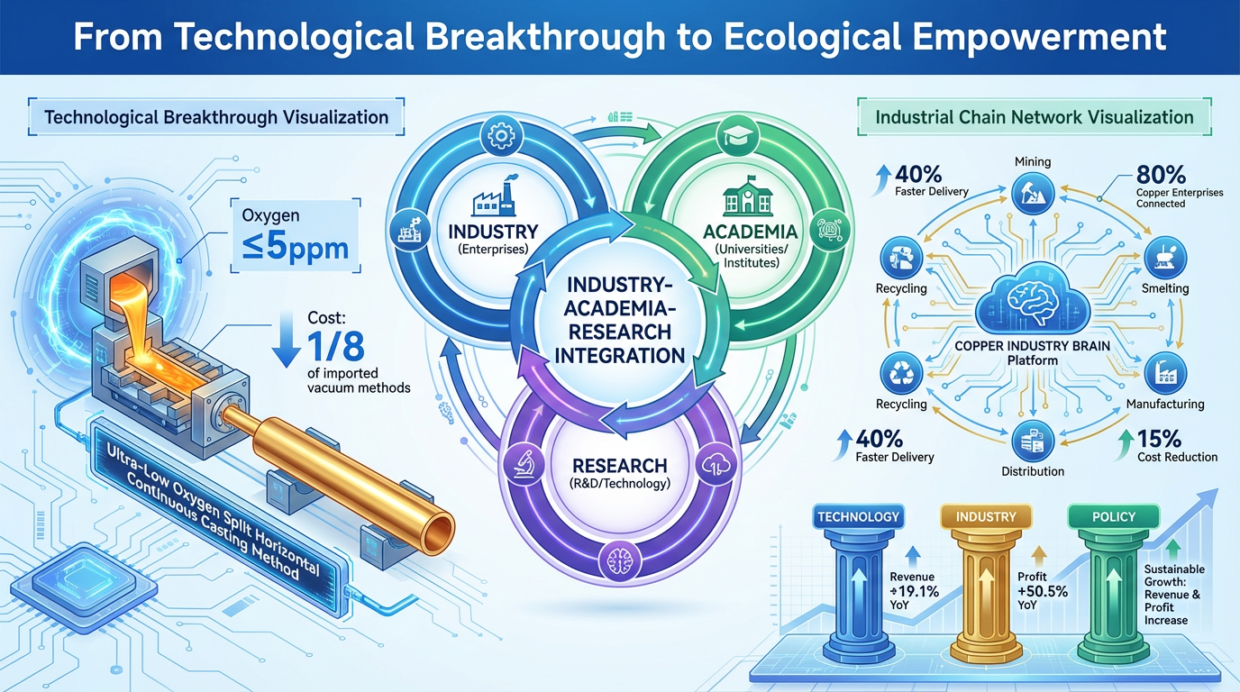 Rozsah spolupráce se rozšiřuje na celý řetězec. Jiangxi měděné podniky vybudovaly "Copper Industry Brain", který spojuje 80 % městských měděných podniků a umožňuje sdílení kapacit a koordinaci objednávek prostřednictvím analýzy velkých dat. Tento platformový přístup umožňuje malým a středním podnikům účastnit se špičkové konkurence: když jedna společnost obdrží super-velkou objednávku, systém ji automaticky rozdělí mezi několik továren pro paralelní výrobu, čímž se zkrátí dodací lhůta o 40 % a náklady o 15 %. Pokud jde o politiku, „Implementační plán rozvoje vysoce kvalitního rozvoje měděného průmyslu (2025–2027)“ výslovně podporuje vytváření inovačních konsorcií, jejichž cílem je překonat 10–12 „úzkých“ technologií do tří let. Tato trojrozměrná synergie „technologie-průmysl-politika“ přispěla k tomu, že měděný průmysl Jiangxi dosáhl 19,1% meziročního růstu tržeb a 50,5% nárůstu zisku v prvních třech čtvrtletích roku 2025.