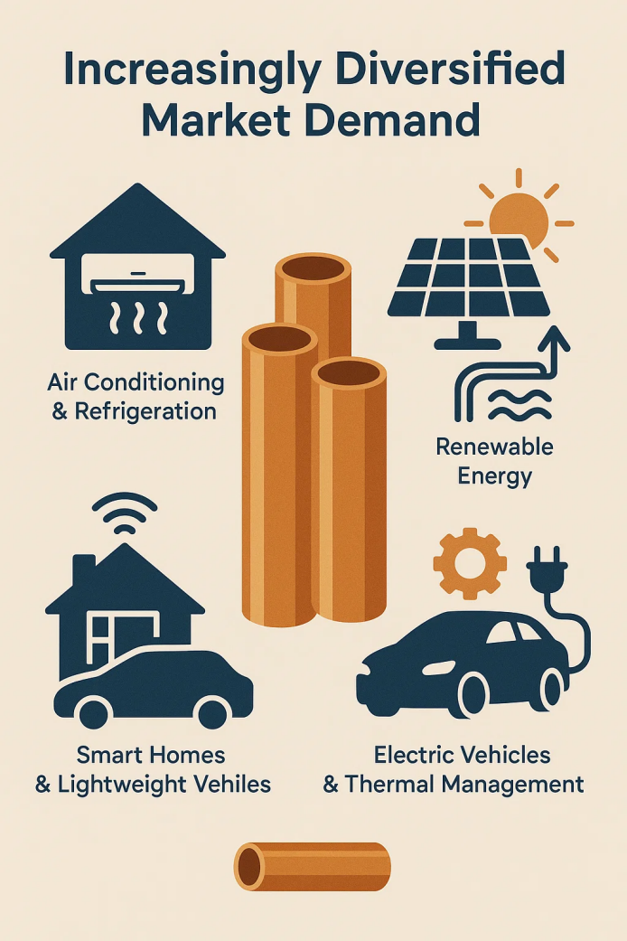 S zrychleným vývojem inteligentních domů, lehkých vozidel a elektrifikace se také rozšiřují aplikace měděných trubek. Vysoce výkonné měděné trubky nejsou pouze základními součástmi kondenzátorů a výparníků v domácích spotřebiči, ale také hrají klíčovou roli v systémech tepelného řízení nových energetických vozidel. Očekává se, že tento trh bude i nadále růst.