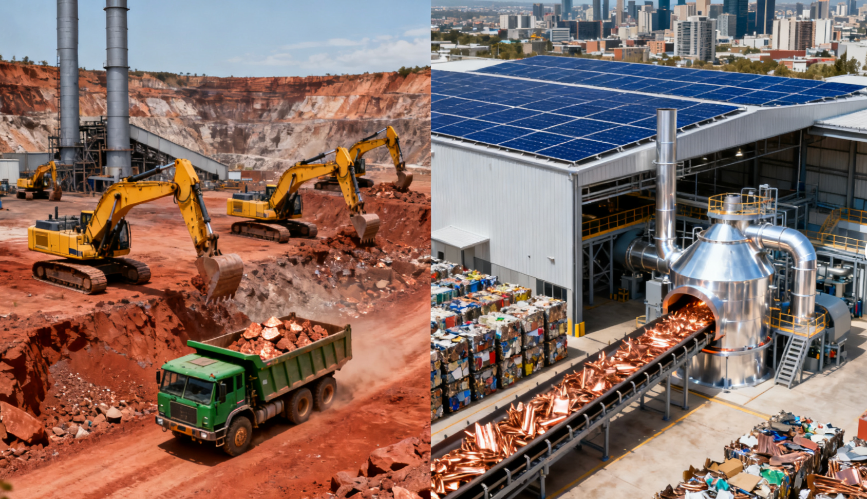 (Titulek: Základní dichotomie: Těžba zdrojů (lineární ekonomika) versus regenerace zdrojů (cirkulární ekonomika) představují protichůdné vize budoucnosti výroby měděných trubek.)