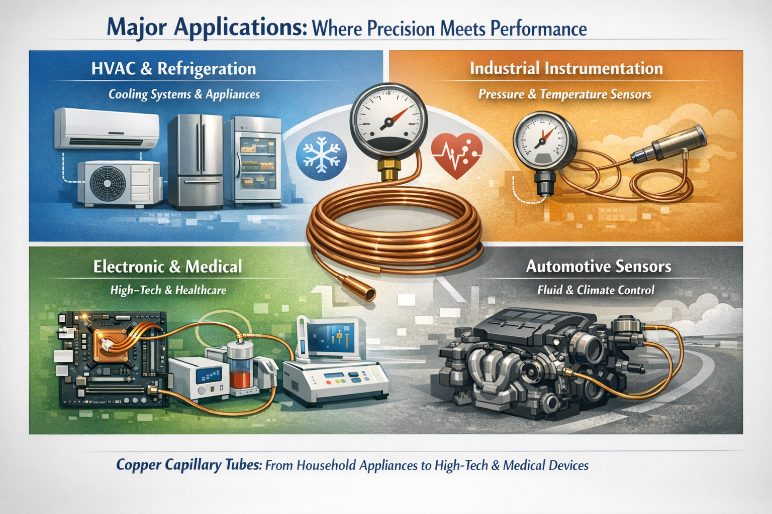 Vzhledem k jejich schopnosti řídit průtok kapaliny s extrémní přesností se měděné kapiláry nacházejí ve všem, od domácích spotřebičů po život zachraňující lékařské vybavení.