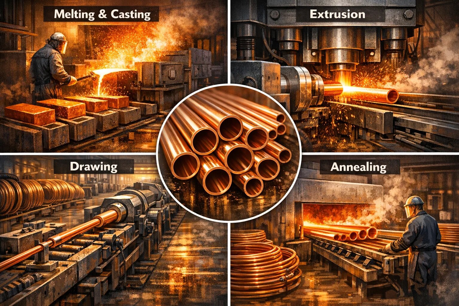 Vstoupit do továrny na měděné trubky je jako vstoupit do světa ohně a přesnosti. Proces přeměny těžkého bloku kovu na tenkou, dutou trubku je inženýrský výkon. Rozdělme to do čtyř jednoduchých kroků: