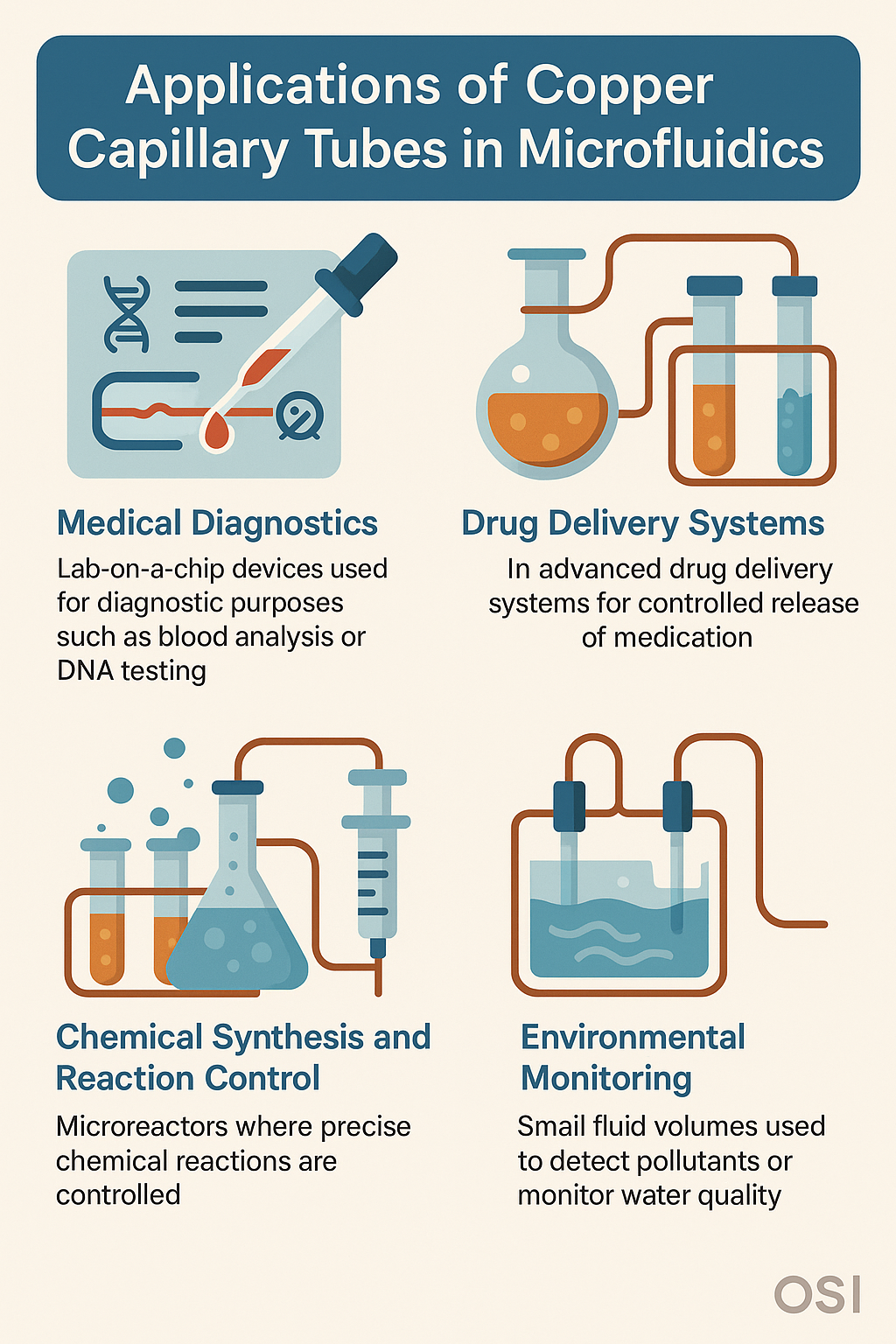 Všestrannost měděné kapiláry umožňuje jejich použití v různých mikrofluidních aplikacích. Některé z nejvýznamnějších oblastí, kde se tyto trubky používají, zahrnují: