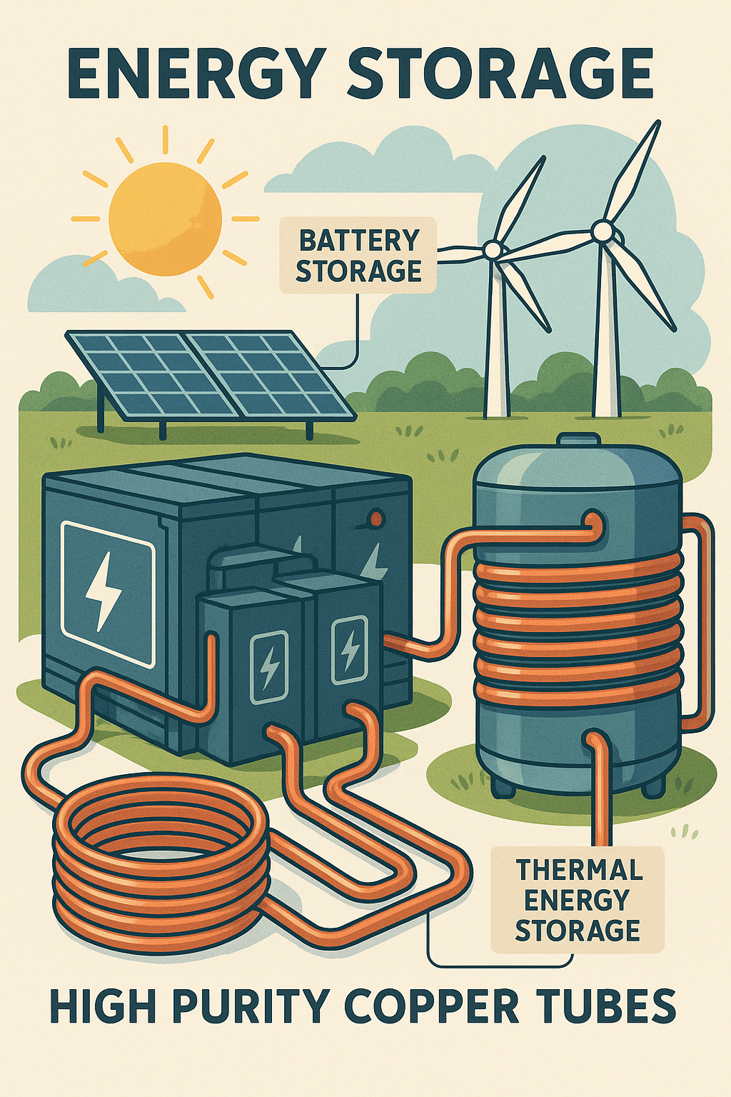 Skladování energie je kritickou složkou infrastruktury obnovitelné energie, která pomáhá vyrovnávat občasnou povahu zdrojů, jako je sluneční a větrná energie. Měděné trubky vysoké čistoty se používají v různých systémech skladování energie, včetně baterie a tepelné akumulační systémy . Tyto systémy vyžadují komponenty, které dokážou efektivně řídit teplo a elektřinu, aby zajistily spolehlivý výkon.