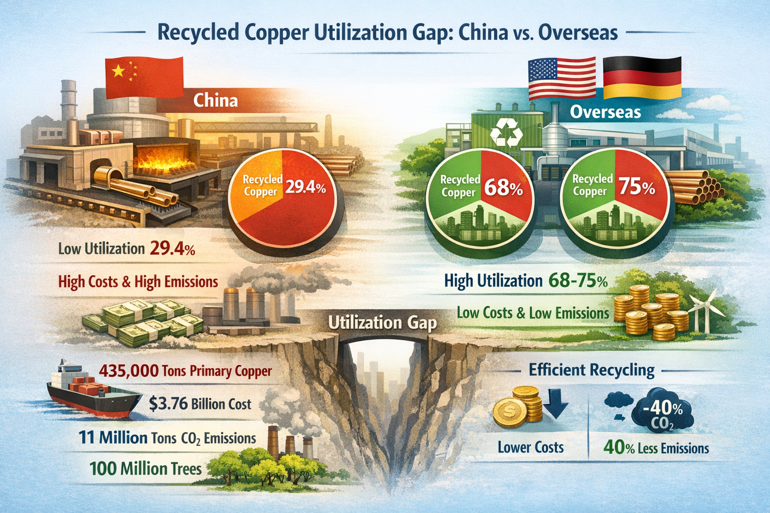 V ostrém kontrastu demonstrují zámořské společnosti vysoce účinné možnosti recyklace . Mueller Industries, přední americký výrobce měděných trubek, se může pochlubit mírou využití recyklované mědi ve výši 68 %. jejich budova a vzduch klimatizace měděné trubky jsou primárně vyrobeny z recyklované mědi a díky přesné optimalizaci procesu a kontrole složení je kvalita produktu k nerozeznání od produktů vyrobených z čisté mědi. Německá skupina KME dále zvýšila míru využití recyklované mědi na 75 %, přičemž využívá sofistikovaný evropský systém třídění a recyklace měděného odpadu k dosažení uzavřeného cyklu „ recyklace šrotu mědi – přesné třídění – tavení a rafinace – výroba měděných trubek ." To vede k výrobním nákladům na tunu měděných trubek, které jsou o 1800–2200 juanů nižší než u čínských společností, a k intenzitě emisí uhlíku, která je pouze 40 % v porovnání s čínskými společnostmi.